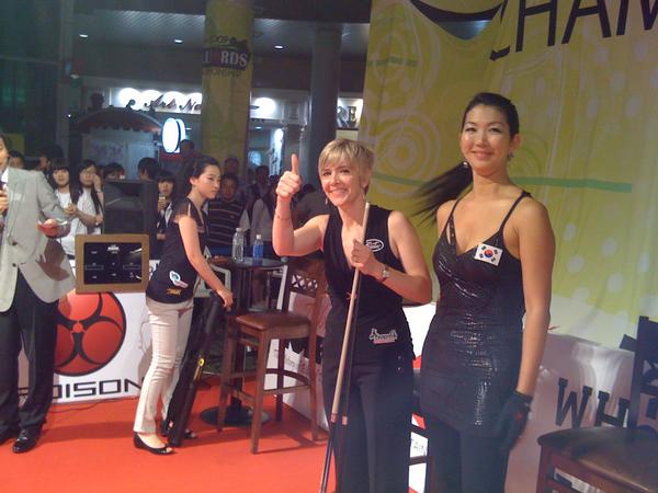 Bucheon, Korea- The 3rd Annual Korea vs World Team took place again at La Festa Shopping Mall featuring some of the brightest stars of billiards today. Making her debut appearance in Korea, Allison Fisher made a huge impact on this year’s outcome. The World Team consisted of Captain George Breedlove (USA), Allison Fisher (ENG), Shanelle Loraine (GUAM), and newbie Zarah Delrosario (PHL). Team Korea was a powerhouse with Captain Hyun Ho Kim (aka Charlie Williams), Yu Ram Cha, Gui Young Lee, and Jeanette Lee. The Dragon Promotions event is aired on XTM and XPORTS, leading Korean channels and sponsored by Takini Cloth, Predator Cues, Poison Cues, Vigma Balls, Ra Beauty Core, Whois.co.kr, La Festa, and Min Tables.