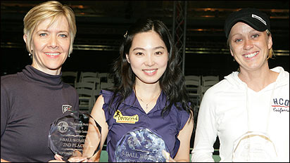 Fisher, Cha and Kjorsvik pose with their new-found hardware that they picked up at the Women’s Pro 9-Ball at the Galveston World Classic.