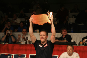 The finals seemed somehow anti-climatic after the two great matches that had preceeded it. There were a few early errors before Mika settled down and took a 10-7 lead. A foul by Mika brought Ralf back to the table for a run-out to make it 10-8. In the next game, Mika was running out but fell tough on the eight and had to try an eight-nine combination. He missed and Ralf cleaned up to draw within a game at 10-9. Ralf then made a break and run to tie the match, 10-10. A terrific safety battle ensued on the one ball in the next game before Mika found an opening and ran out. It was 11-10. In game twenty two Mika fouled on the two ball, giving Ralf ball in hand. Ralf was running out when he unexpectedly scratched on the seven ball. That’s all she wrote. Mika wipes up that game for a 12-10 lead and makes a ball on the break in the next game. He is left with an awkward billiard from the one to the nine which he studies for some time. Finally he takes the bridge from referee Scott Smith and lines up the shot. PERFECTO! We have our 2009 U.S. Open champion – MIKA IMMONEN!