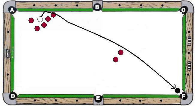 The shot I wish to teach you today is a shot that could easily come up in a game and is makeable with a few adjustments to fine tune your aim. Here, we are combining a kick shot with a jump shot. However, the physics involved is so much more complex than the mere geometry a novice pool player might consider. The cue ball is placed so that there is little room to effect a jump shot over the obstructing wall. While the Eric Yow Jump Cue can jump a ball from as close as 1 millimeter away, most jump cues cannot, and it is not a practical shot when you want to get distance like we do here. So, the answer to the riddle is to jump off of the long rail in such a way as to send the cue ball with a kick shot traveling all the way down table to the far corner to pocket a ball.