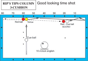 Set the cue ball perpendicular to yellow ball, (give or take 2 or 3 inches), and hit the yellow ball with cue ball using 10 o’clock English and a medium firm stroke. You should make this shot fairly easily and have some fun doing so.