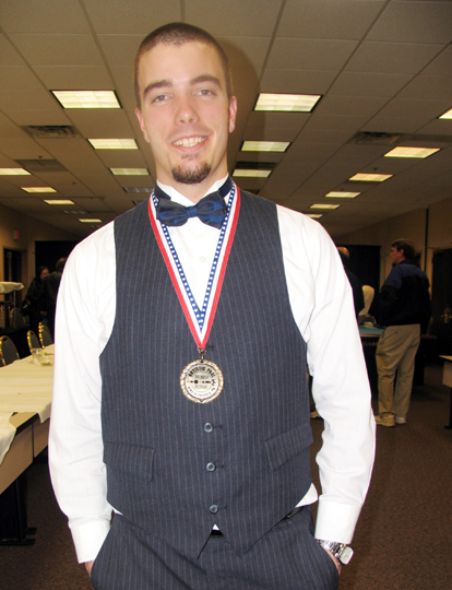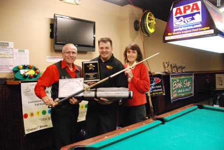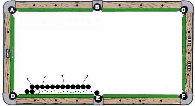 Everyone likes an easy trick shot to keep in their pocket to whip out  just to show off from time to time.  Sometimes the shots I feature here  are quite difficult, but I like to put in some easy ones on occasion.   This is a shot that is pretty easy, so long as you set it up right and  use a good jump cue.  Start by placing the three balls at the side  pocket, as diagrammed.  The two balls closest to the side pocket are in  line, directly across table.  Set the third ball up, accounting for a  bit of throw, aimed about a diamond short of the corner pocket.  With  this set-up, you should be able to strike the middle ball and pocket all  three with one stroke.  The way it is diagrammed, I have you jumping  the cue ball over a wall of balls to pocket the easy three.  The only  trick to this one is planning where the cue ball will land before  striking the middle ball.  If you hit it too hard or too soft, it  changes the throw of the third ball, so practice with a consistent hit  and consistent elevation.  If you jump too hard and land on the middle  ball, it will throw the middle ball too much.